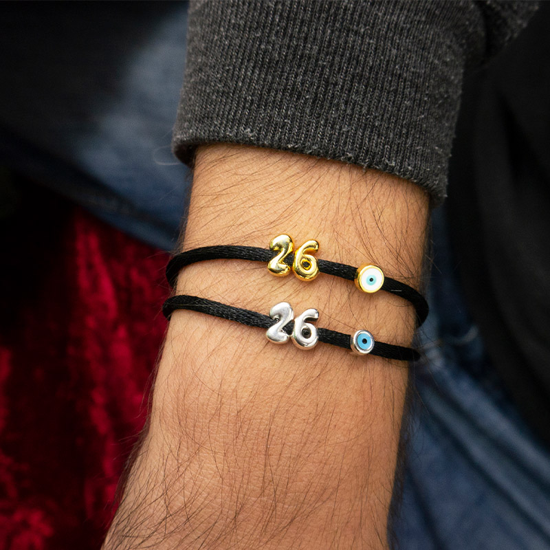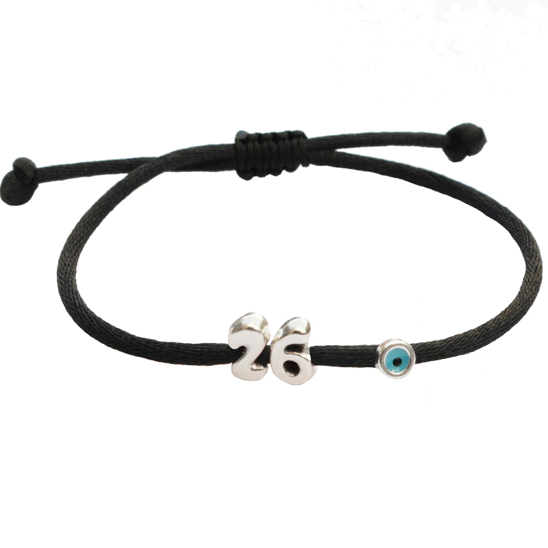 Κάνε δώρο στους αγαπημένους σου ένα μοναδικό, unisex, χειροποίητο βραχιόλι γούρι 26 με ματάκι! Τα βραχιόλια είναι φτιαγμένα από ανθεκτικό, επαργυρωμένο ΖΑΜΑΚ 999ο ( ασημί) ή επυχρυσωμένο ΖΑΜΑΚ 24Κ, περασμένα σε κόκκινο μπορντό ή μαύρο σατέν κορδόνι και μπορούν να μετακινηθούν. Το βραχιόλι κλείνει με πλέξη μακραμέ και αυξομειώνεται ως προς το μήκος, για να προσαρμόζεται σε κάθε καρπό.
