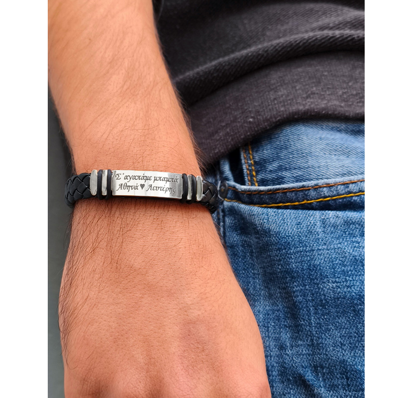 Κατασκευασμένο από συνθετικό δέρμα και ταυτότητα από ανοξείδωτο ατσάλι, συνδυάζει στιλ, αντοχή και προσωπικότητα. Εδώ μπορείς να χαράξεις ό,τι θέλεις: ένα όνομα, μια ημερομηνία, μια φράση με νόημα. Κάτι μοναδικό, όπως η ιστορία σας. Φόρεσέ το καθημερινά ή χάρισέ το ως ένα ξεχωριστό, προσωποποιημένο δώρο σε κάποιον που σημαίνει πολλά για εσένα.