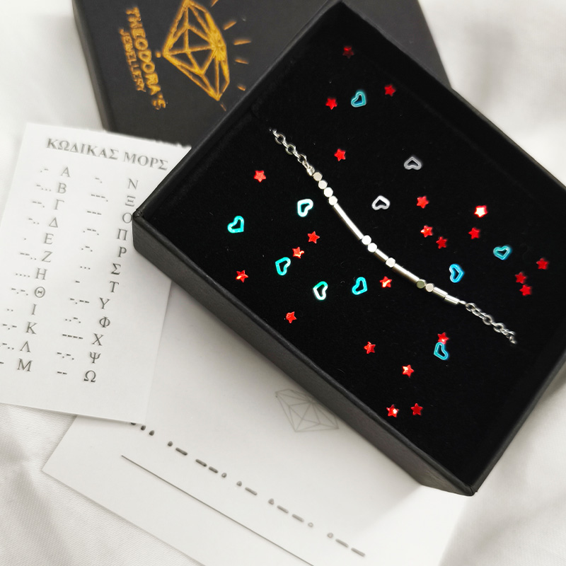 - Το βραχιόλι συνοδεύεται από κάρτα που αναγράφει την λέξη σε κώδικα Μορς, καθώς και το αλφάβητο σε κώδικα Μορς, για να μπορεί να το ανακαλύψει μόνος του/ μόνη της!