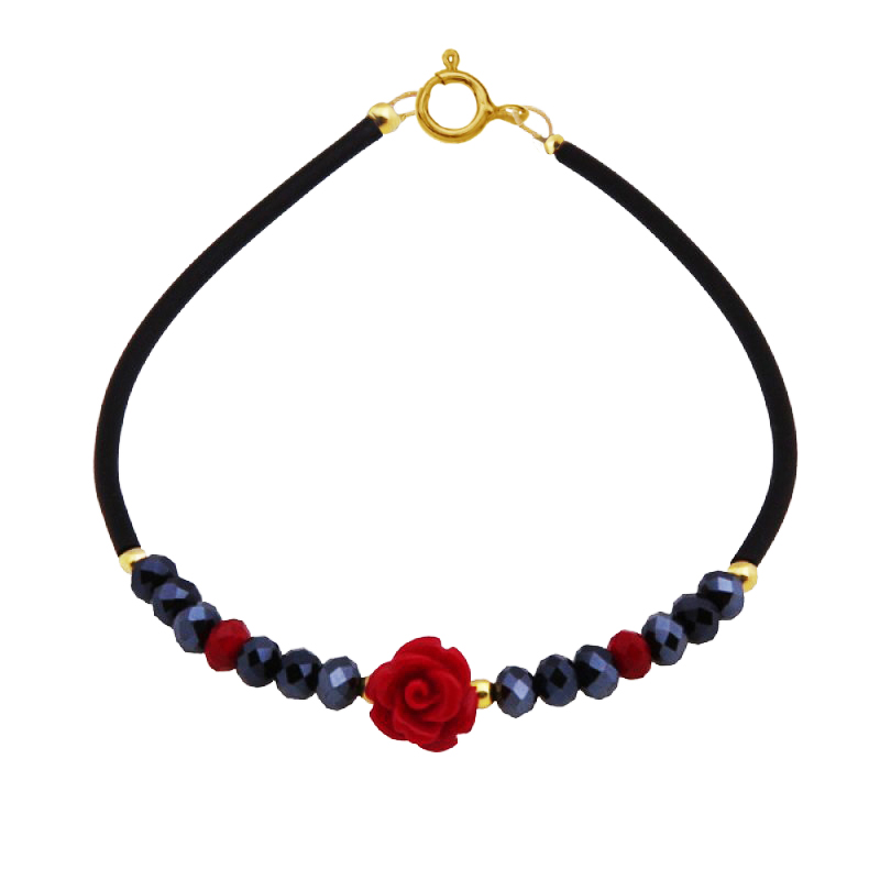 Χειροποίητο βραχιόλι τριαντάφυλλο από επιχρυσωμένο ασήμι με κρύσταλλα, λουλούδι από κόκκινο συνθετικό κοράλλι και μαύρο καουτσούκ που καταλήγει σε ασημένια κουμπώματα.¨Ενα χαριτωμένο πρωτότυπο βραχιόλι που θα λατρέψετε!