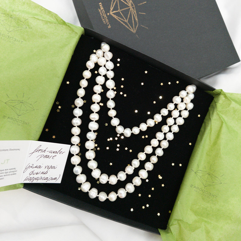 Εντυπωσιακό, χειροποίητο, μακρύ κολιέ από άσπρα, οβάλ και στρογγυλά, φυσικά μαργαριτάρια fresh water pearls, 8mm - 9mm περίπου, μήκους 140cm, δεμένα στο χέρι κόμπο κόμπο για ασφάλεια. Τα fresh water pearls ειναι αληθινά μαργαριτάρια γλυκού νερού που καλλιεργούνται σε κλειστές λιμνοθάλασσες, εκβολές ποταμών και λίμνες. Το κολιέ μπορεί να φορεθεί με πολλούς τρόπους. Διπλό, τριπλό, γραβάτα, με κόμπο ή τυλιγμένο σαν τσόκερ στο λαιμό και το υπόλοιπο μακρύ. Ένα διαχρονικό κόσμημα για κάθε περίσταση που θα απογειώσει την εμφάνισή σας. Συνδυάζεται υπέροχα με καρφωτά σκουλαρίκια μαργαριτάρι και ασορτί δαχτυλίδι. Άν προτιμάς κάποιο άλλο μήκος, μην διστάσεις να επικοινωνήσεις μαζί μας!