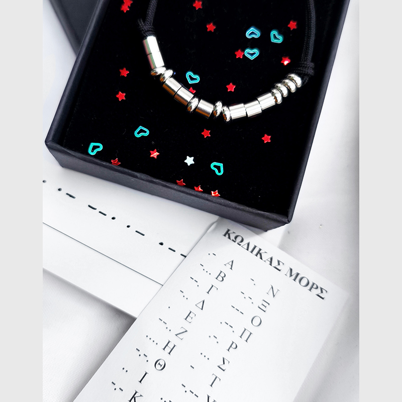 - Το βραχιόλι συνοδεύεται από κάρτα που αναγράφει την λέξη σε κώδικα Μορς, καθώς και το αλφάβητο σε κώδικα Μορς, για να μπορεί να το ανακαλύψει μόνος του/ μόνη της!